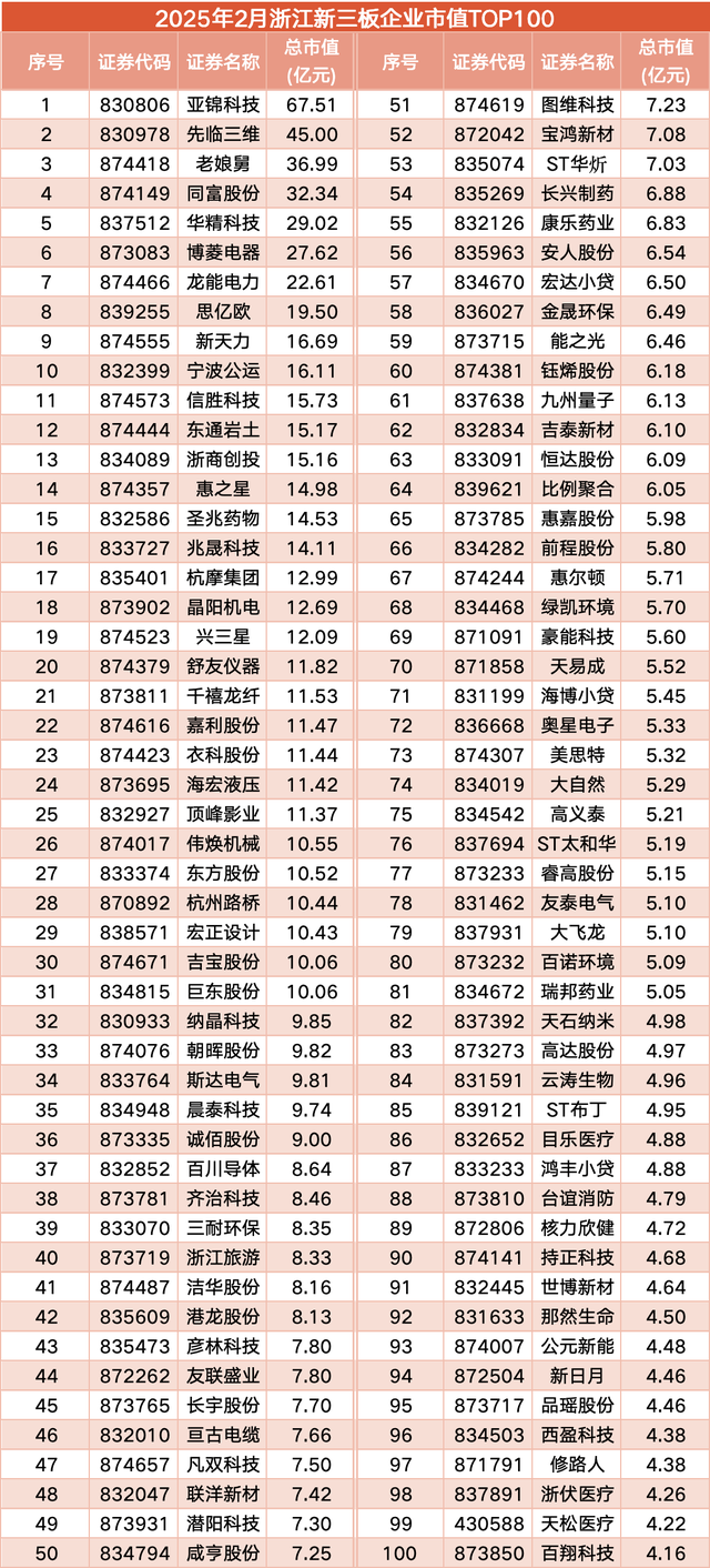 2025年2月浙江新三板企业市值TOP100: 5家企业排队北交所IPO